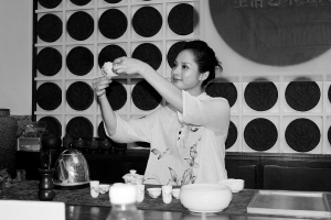 备具、烫杯、置茶、润茶、闻香、冲泡、敬茶,动作干净利落,井井有条,仪态从容优雅,面带微笑……