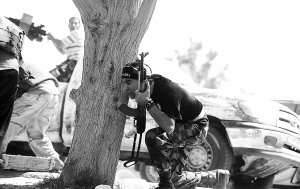 | 八月二十一日,一名利比亚反对派武装人员在利比亚首都的黎波里西部地区与政府军交战时下蹲躲避枪弹。 新华社/法新 |
