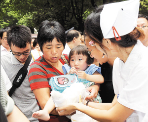 8月22日,在上海新华医院儿科楼前,小伊伊被抱下救护车。
