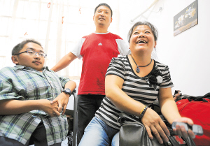 8月22日,金鑫和他的父母在学校宿舍里。 当日是浙江大学新生报到的第一天,来自浙江台州市椒江区的金鑫,在父母及当地残联工作人员的陪伴下,前往浙江大学紫金港校区报到。 今年20岁的金鑫,因生来就瘫痪、生活无法自理,一直由其母亲施冬娟背着去上学,最终完成了12年寒窗苦读,并以648分的高考成绩被浙江大学工科试验班录取。 为方便照顾金鑫的生活起居,学校特意安排了一间特护寝室;对于陪儿子读大学的施冬娟,学校还表示将尽力安排工作。 新华社记者 韩传号 摄