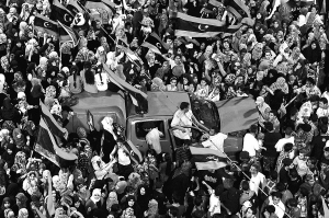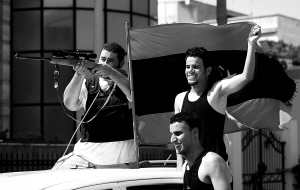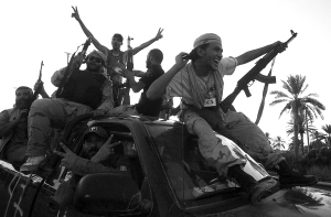↑反对派武装人员在首都的黎波里的街道上庆祝。
