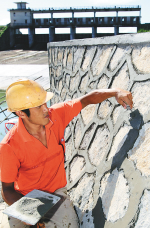 8月22日,琼海市潭门镇的合水水库,施工人员抓紧修复水库溢洪道。 去年10月份的洪涝灾害后,琼海市需要修复水毁工程380宗、共3600多处,所需建设资金共3500万元。目前,所有水毁项目基本竣工。 文/本报记者 胡续发 图/本报记者 李英挺