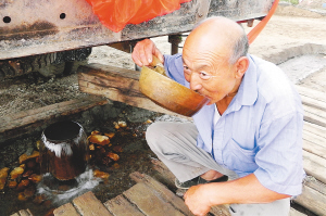 8月24日,内蒙古托克托县一间房村村民马科小在新打的水井边喝水。 当日,在北京军区给水工程团打井队伍的帮助下,内蒙古自治区托克托县一间房村成功打出一眼深水井,使困扰当地群众多年的饮水安全问题得到解决。 受水文地质条件复杂等因素制约,内蒙古托克托县古城镇一间房村农民祖祖辈辈吃的是苦碱水、高氟水和高砷水,对身体健康造成一定影响。 新华社记者 李云平摄