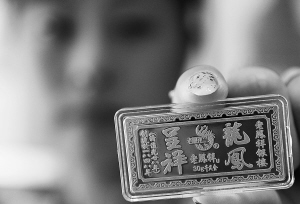 | 业内人士提醒消费者,即使处在黄金牛市,投资者也要保持谨慎,理性投资,切勿盲目跟风。 图为在山东临沂市一家金店,工作人员展示一款金条。 新华社发 |