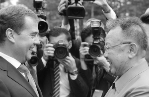 金正日表示朝鲜准备无条件返回六方会谈 8月24日,在俄罗斯布里亚特共和国首府乌兰乌德附近的军事基地,俄总统梅德韦杰夫(左)会见到访的朝鲜最高领导人金正日。当日,梅德韦杰夫和金正日举行会晤。 金正日在会谈中向梅德韦杰夫表示,朝鲜准备无条件返回六方会谈,并将在谈判期间做好停止生产核材料以及停止核试验的准备。双方一致同意,将制定通过朝鲜向韩国出口天然气的管道铺设方案。俄罗斯责成有关部门成立特别委员会,确定过境朝鲜领土输气的双边合作具体参数,并相应邀请韩国参与该项目。 新华社/俄新社