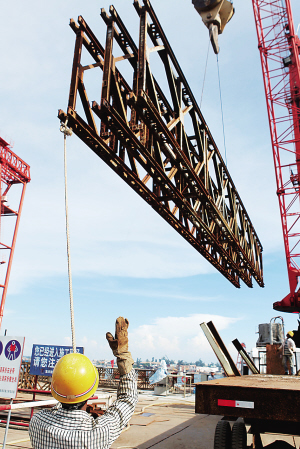 | 8月24日,洋浦跨海大桥工程现场,一名工人正在进行吊装作业。该工程目前已完成总工程量的20%。 本报记者 苏晓杰 摄 |