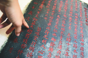 | 文昌市八门湾的一块清代村规民约碑,碑文上显示了当地村民们自觉保护红树林自古有之。 本报记者 张杰 摄 |