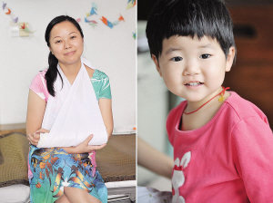 ↑ 这是8月25日分别拍摄的在病房中恢复的吴菊萍(左)和“坠楼女孩”妞妞(拼版照片)。