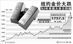 24日,纽约商品交易所黄金期货市场交投最活跃的12月合约收于每盎司1757.3美元,比前一交易日下跌104美元,跌幅达5.6%,为2008年3月以来的最大单日跌幅。而国际现货黄金则更为激烈地下挫了150美元。截至记者发稿时,国际金价跌势未止,已滑落至每盎司1730美元附近。