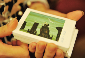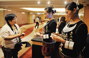 | ③台北市举行的影展上,黎族姑娘向影友赠送精美的图片册。 |