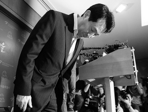 8月26日,韩国首尔市长吴世勋在首尔举行的新闻发布会上鞠躬。