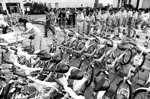 倡导低碳出行 千辆自行车送员工 8月26日,员工排队领取崭新的折叠自行车。 当日,杭州某公司将特地定制的1000辆自行车送给员工,倡导低碳出行。 新华社发(梁臻 摄)