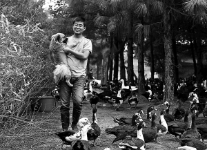 8月29日,张军和他的鸭子、爱犬在一起。 今年27岁的张军是武汉华中农业大学农业昆虫与害虫防治专业的研究生,2010年他毕业后毅然回到家乡安徽省宣州区黄渡乡驿山余村,建生态园,办养殖场,踏上了自主创业之路。他利用昆虫黄粉虫及其副产品来养殖番鸭:鸭粪作为有机肥料养殖绿色蔬菜,而绿色蔬菜再饲喂黄粉虫,黄粉虫又是番鸭和鱼的食物。2010至2011年间,他饲养的1200只鸭给他带来了15万元的收益。 新华社稿(李晓红 摄)