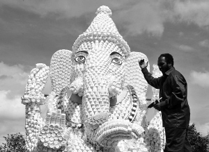8月29日,在印度的海德拉巴,印度艺术家苏利耶·普拉卡什为参加将于9月1日开始的加内什节的神像作最后的装饰。 普拉卡什在5名工人的帮助下,用了30000个纸杯制造了这个高17英尺(约5.1816米)的神像,期望此举能最大限度的减少对环境的破坏。 新华社/法新