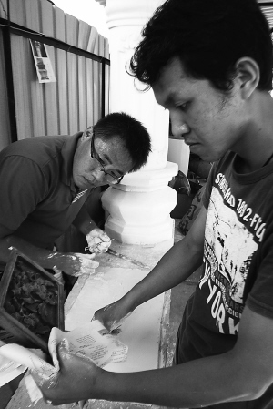 “最后,我们还会用刻刀把多余的灰泥剔除,雕塑出与木雕上一模一样的图案,整个过程需要三四个小时。”他们介绍说。