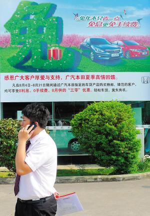 | 九月二日,一名广汽本田汽车销售人员,在零利息、零手续费、零月供广告牌下回答客户咨询。 本报记者 苏晓杰 摄 |
