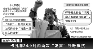 正在逃亡的穆阿迈尔·卡扎菲9月1日再次通过一家叙利亚电视台发表录音讲话,宣称自己绝不会投降,呼吁支持者继续抵抗,做好长期作战准备。