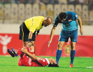 | 陈涛(下)在比赛中受伤倒地。新华社发 |