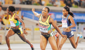 | 9月2日,牙买加选手坎贝尔(中)在女子200米决赛中以22秒22的成绩获得冠军。 新华社发 |