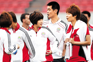| 9月2日,中国女足进行恢复训练,备战与朝鲜队的比赛。图为主教练李霄鹏(中)在训练场上。 小新发 |