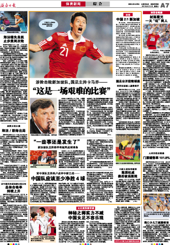 世界杯预选赛中国队2:1逆转战胜新加坡