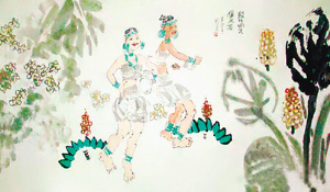 | 牧之中国画《鼓乐响来姐妹花》 |