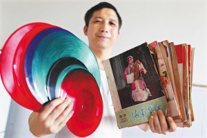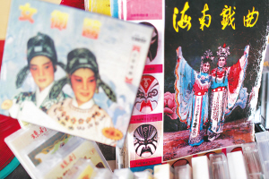 采访中,“职业票友”刘飞向记者展示了他的部分收藏:1982年创刊、已停刊多年的《海南戏曲》杂志及其他琼剧书籍;部分薄膜唱片、黑胶唱片。