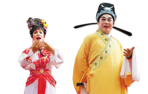 | 票友们常得到名家指点。图为琼剧名家陈振安(右)和票友黄雪娟同台演唱折子戏《春水浇桃花》。 海南日报记者 陈德雄 摄 |