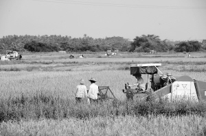 9月3日,琼海市嘉积镇勇敢村的群众在抢收晚稻。今年琼海市5万多亩晚稻遭受严重稻飞虱病虫害,占播种总面积的四分之一,群众反映受灾最严重的稻田至少减产一半以上。目前这部分晚稻距完全成熟还有一周时间,为防止风吹雨打造成更大损失,群众纷纷借助好天气提前投入抢收。 特约记者 蒙钟德 摄