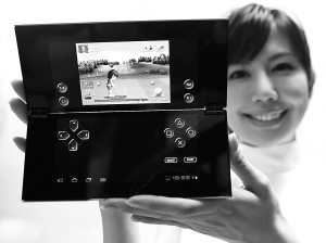 在日本首都东京的一个展销会上,一名模特展示索尼的平板电脑Tablet P。 近日,索尼正式公布了两款基于谷歌Android操作系统的平板电脑Tablet S与Tablet P。 新华社/路透