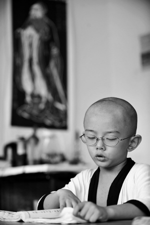| 一名在“孔子学堂”上学的孩子正在诵读古文,墙上挂着孔子画像。