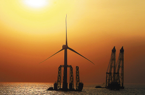东海大桥风电场二期工程正在安装风力发电机组。近日,我国首座海上风力发电场———上海东海大桥风电场发电量累积超过2亿千瓦时。该风电场拥有34台我国自主研发的3兆瓦风电机组,于2010年6月正式并网发电。与燃煤电厂相比,上海东海大桥风电场每年可以节约8.6万吨标准煤,减轻排放温室效应性气体二氧化碳23.74万吨,节能减排效益显著。 新华社发