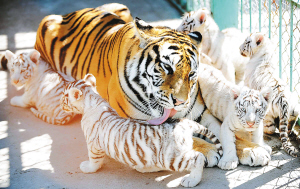 在黑龙江东北虎林园里,五只孟加拉小白虎由于“生母”奶水不足险些断奶送命,关键时刻一只东北虎“挺身而出”担起“奶妈”重任。目前这四雌一雄五只小白虎已两个月大,已经断奶,但仍旧恋恋不舍地亲近在东北虎“奶妈”左右。 新华社发