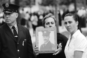 9月11日,在美国纽约世贸中心遗址,在“9·11”恐怖袭击事件中丧生的消防员约瑟夫·阿涅洛的母亲(中)参加悼念仪式。 新华社/法新