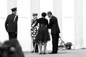 9月11日,美国总统奥巴马来到宾夕法尼亚州尚克斯维尔的93号航班纪念园,向该航班上的遇难者敬献花圈,以纪念在十年前这场恐怖袭击中的死难者。新华社记者王丰丰摄
