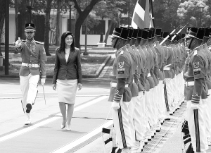 9月12日,在印度尼西亚首都雅加达的总统府,到访的泰国总理英拉·西那瓦(左二)检阅印尼仪仗队。 当日,印度尼西亚总统苏西洛说,印尼与泰国将扩大在贸易、能源和农业领域的合作,同时印尼将在柬泰边境冲突解决中发挥更大作用。泰国新总理英拉10日至15日进行上任后首次外交之旅,访问的国家分别是文莱、印尼、柬埔寨和老挝。 新华社/法新