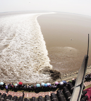 9月13日,在观潮胜地浙江海宁盐官景区,钱塘江蔚为壮观的“一线潮”吸引了各地观众的目光。当天是农历八月十六,据杭州水文信息网报,盐官观潮等级已经升至观潮最高等级5级。 新华社发