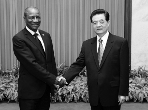 9月16日,国家主席胡锦涛在北京人民大会堂会见几内亚总统孔戴,双方就巩固和发展中几友好合作关系深入交换了意见,达成广泛共识。胡锦涛表示,中方愿同几方共同努力,把两国关系提高到新的水平。 新华社记者 张铎 摄