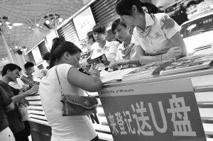从购物袋、水杯到U盘,经销商准备了不少礼品吸引消费者。