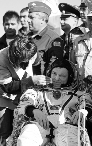 9月16日,在距离哈萨克斯坦城市杰兹卡兹甘东南92英里(约148公里)处,搭乘“联盟”号飞船返回舱顺利着陆的俄罗斯宇航员亚历山大·萨莫库佳耶夫接受工作人员协助。
