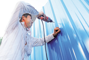 9月14日,海口市龙昆南路道客村路段,施工人员正在设置围挡板,为道客村人行天桥项目做施工前准备。
