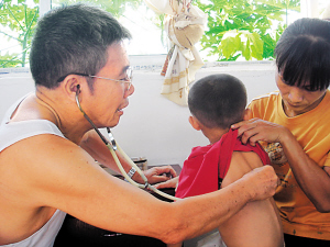 6岁的陈清星走进来,说是患了感冒。徐凤翲拿起听诊器诊断后准备开药。