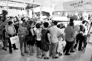 | 9月17日,第五届海南汽车展销会迎来了开展以来的人流高峰。图为领奖品的观众排起了长队。 本报记者 王凯 摄 |