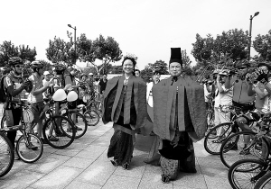 9月17日,上海的自行车爱好者赵永超与刘诗勤在徐汇区滨江公园举行了一场特别的低碳“汉服婚礼”。两位新人是自行车运动爱好者网站“骑众网”的“骑友”,为了身体力行低碳理念,并与众多“骑友”共享欢乐。 新华社发