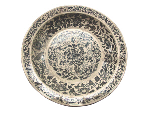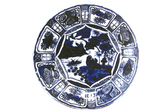 江建新介绍,景德镇地区生产的克拉克瓷的造烧年代,大约兴烧于距今400年前的明代万历年间(1573年-1620年),到了清代顺治年间基本停烧。从传世与出土的克拉克瓷来看,常见品种有碗、盘、杯、瓶、小罐、军持等,其中盘最为常见。盘的纹饰一般在器物内壁的口沿部分饰一周大小排列有序的开光,大开光内多饰以花草、虫蝶、杂宝等;小开光内饰以缨络、缀珠、万字、绵纹、几何纹等。盘心圆圈内饰有石山树木、池塘禽鸟、水榭亭阁、仕女人物、花盆小景等。这种布局饱满,分层构图的独具特色的装饰形式,被视之为克拉克瓷典型风格。