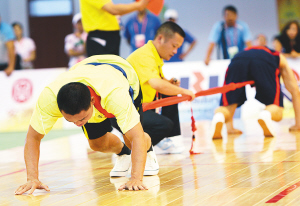 | 海南选手张明昌在全国第九届少数民族传统运动会押加项目76公斤级决赛中。