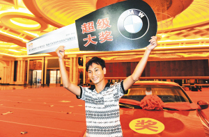 | 9月18日,第五届海南汽车展销会抽奖活动诞生超级大奖,市民林旺喜中价值35万元的宝马车一辆。 本报记者 王凯 摄 |