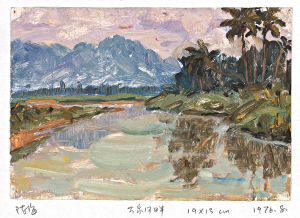 《胶园》是陈海的毕业创作,白色的晨曦透过露气弥漫的胶林,衬托出三个采胶女工的丰腴身影。画面的空间处理虽然采用的是写实主义惯用的焦点透视法,但在人物和道具的造型及整个画面的色彩处理方面,却带有较强的装饰性。这幅画被刊登在多种报刊上,是一幅较受社会欢迎的作品,而陈海自己并不满意。确实,比起那些扎实而富有表现力的习作来,我们认为《胶园》这幅毕业创作并未反映出陈海真实水平来。在一篇自叙中,陈海坦率地承认自己在主题性创作方面的不足,尤其是当他看到同时期四川美术学院学生的毕业创作时。他的这种对自己真实、坦然、谦逊的态度,是当代艺术家中最难得的一种品质,它不仅使他的艺术赢得了真正的观众,也使我们懂得了艺术在生活中本来的意义。
