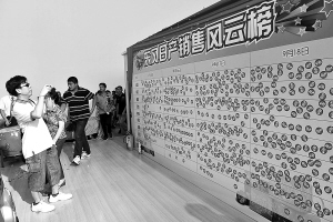 ↑ 一家车商的销售榜上贴满了已售车辆的标签。 |