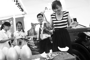 ↑ 一位购买新车的女士现场砸开金蛋收好礼。 |